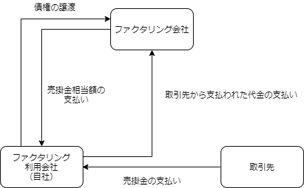 ファクタリング利用会社がファクタリング会社に売掛債権を譲渡すると、売掛金相当の金額がファクタリング会社から支払われます。支払期限を迎えると債務者から売掛金が支払われますので、その金額をファクタリング会社に収めて2社間ファクタリングの流れは完了です。